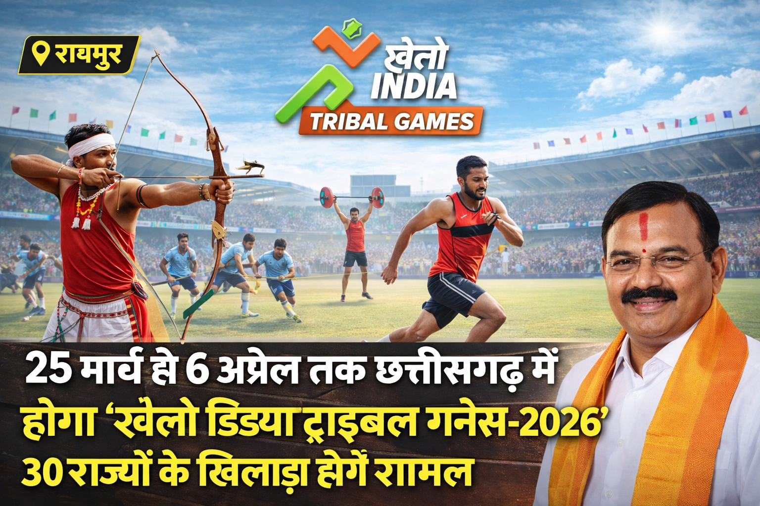 25 मार्च से 6 अप्रैल तक छत्तीसगढ़ में होगा ‘खेलो इंडिया ट्राइबल गेम्स 2026’, 30 राज्यों के खिलाड़ी होंगे शामिल 25 मार्च से 6 अप्रैल तक छत्तीसगढ़ में होगा ‘खेलो इंडिया ट्राइबल गेम्स 2026’, 30 राज्यों के खिलाड़ी होंगे शामिल रायपुर, 6 मार्च 2026: छत्तीसगढ़ में खेल प्रतिभाओं को बढ़ावा देने और जनजातीय क्षेत्रों के खिलाड़ियों को राष्ट्रीय मंच देने के उद्देश्य से ‘खेलो इंडिया ट्राइबल गेम्स छत्तीसगढ़-2026’ का आयोजन 25 मार्च से 6 अप्रैल 2026 तक किया जाएगा। इस प्रतियोगिता का आयोजन रायपुर, सरगुजा और बस्तर के विभिन्न खेल मैदानों में होगा। मुख्यमंत्री विष्णु देव साय ने मंत्रालय महानदी भवन में आयोजित खेल एवं युवा कल्याण विभाग की समीक्षा बैठक में इस आयोजन की तैयारियों की विस्तृत जानकारी ली और अधिकारियों को आवश्यक निर्देश दिए। मुख्यमंत्री श्री साय ने कहा कि युवा ही देश और प्रदेश का भविष्य हैं और राज्य सरकार शिक्षा, रोजगार, कौशल विकास तथा खेल सहित सभी क्षेत्रों में युवाओं को आगे बढ़ाने के लिए प्रतिबद्ध है। उन्होंने कहा कि यह प्रतियोगिता जनजातीय क्षेत्रों के खिलाड़ियों की प्रतिभाओं को पहचान देने और उन्हें राष्ट्रीय स्तर तक पहुंचाने का एक महत्वपूर्ण मंच बनेगी। बैठक के दौरान मुख्यमंत्री ने छत्तीसगढ़ क्रीड़ा प्रोत्साहन योजना, खेल अधोसंरचना के निर्माण, खेल अकादमियों की गतिविधियों और आगामी खेल आयोजनों की भी समीक्षा की। उन्होंने अधिकारियों को निर्देश दिया कि सभी निर्माण कार्य निर्धारित समय-सीमा में और बेहतर गुणवत्ता के साथ पूरे किए जाएं। उल्लेखनीय है कि भारत सरकार द्वारा आयोजित होने वाले पहले खेलो इंडिया ट्राइबल गेम्स की मेजबानी छत्तीसगढ़ को दी गई है। इस प्रतियोगिता में कुल 7 प्रतिस्पर्धात्मक और 2 प्रदर्शनात्मक खेल शामिल होंगे। रायपुर में तीरंदाजी, फुटबॉल, हॉकी, वेटलिफ्टिंग, स्वीमिंग और कबड्डी (डेमो) का आयोजन होगा, जबकि सरगुजा में कुश्ती और मलखम्ब (डेमो) तथा बस्तर में एथलेटिक्स प्रतियोगिताएं आयोजित की जाएंगी। इस आयोजन में देश के लगभग 30 राज्यों से करीब 2500 खिलाड़ी और अधिकारी भाग लेंगे। मुख्यमंत्री ने कहा कि खेलो इंडिया में उत्कृष्ट प्रदर्शन करने वाले खिलाड़ियों को प्रोत्साहन राशि दी जाएगी। साथ ही मलखम्ब खिलाड़ियों को एक लाख रुपये की विशेष प्रोत्साहन राशि प्रदान की जाएगी। उन्होंने यह भी बताया कि अमेरिका गॉट टैलेंट में चयनित मलखम्ब खिलाड़ी अनतई पोटाई के अमेरिका आने-जाने का खर्च राज्य सरकार द्वारा वहन किया जाएगा। मुख्यमंत्री ने कहा कि बस्तर ओलंपिक में 1.65 लाख से अधिक युवाओं की भागीदारी इस बात का प्रमाण है कि छत्तीसगढ़ शांति, विकास और सकारात्मक बदलाव की दिशा में आगे बढ़ रहा है। जनजातीय क्षेत्रों म